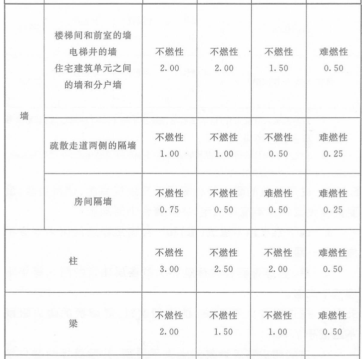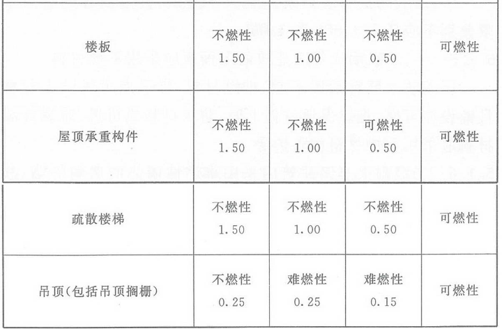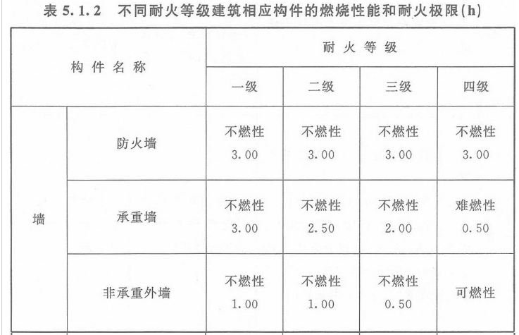 建筑整体的耐火性能是保证建筑结构在火灾时不发生较大破坏的根本,而单一建筑结构构件的燃烧性能和耐火极限是确定建筑整体耐火性能的基础。故表5.1.2规定了各构件的燃烧性能和耐火极限。
