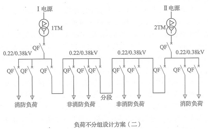 如果生产、生活用电与消防用电的配电线路采用同一回路,火灾时,可能因电气线路短路或切断生产、生活用电,导致消防用电设备不能运行,因此,消防用电设备均应采用专用的供电回路。同时,消防电源宜直接取自建筑内设置的配电室的母线或低压电缆进线,且低压配电系统主接线方案应合理,以保证当切断生产、生活电源时,消防电源不受影响。