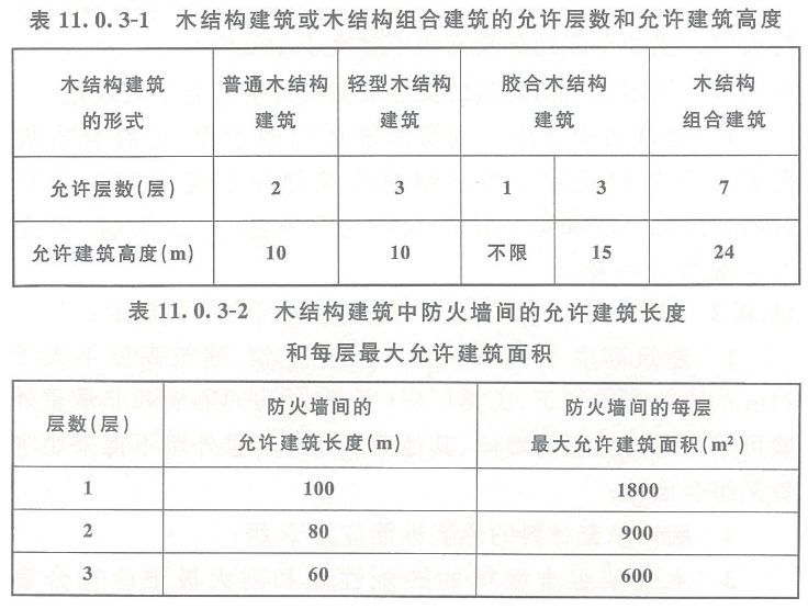 甲、乙、丙类厂房(库房)不应采用木结构建筑或木结构组合建筑。丁、戊类厂房(库房)和民用建筑,当采用木结构建筑或木结构组合建筑时,其允许层数和允许建筑高度应符合表11.0.3-1的规定,木结构建筑中防火墙间的允许建筑长度和每层最大允许建筑面积应符合表11.0.3-2的规定。