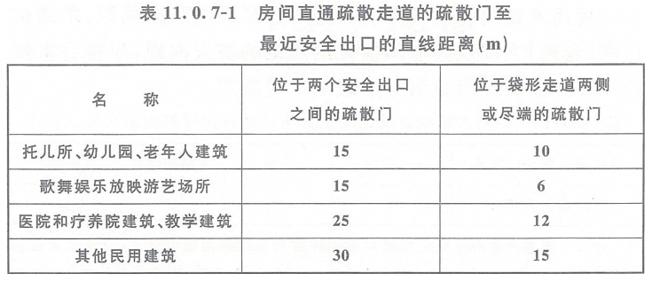 房间内任一点至该房间直通疏散走道的疏散门的直线距离,不应大于表11.0.7-1中有关袋形走道两侧或尽端的疏散门至最近安全出口的直线距离;