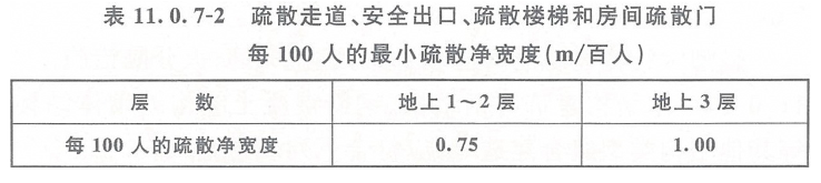 建筑内疏散走道、安全出口、疏散楼梯和房间疏散门的净宽度,应根据疏散人数按每100人的最小疏散净宽度不小于表11.0.7-2的规定计算确定;