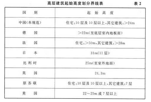中、美、日等几个国家对高层建筑起始高度的划分如表 2。