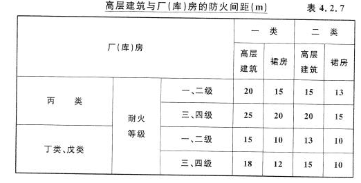 对丙、丁、戊类的厂房、库房,目前设在大、中城市市区的还比较多,需要规定其与高层民用建筑之间的防火间距。本条参照《建规》的有关规定和消防实践以及高层民用建筑的重要性等在表4.2.7中作了具体规定。