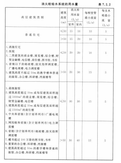 四、消防竖管流量的确定。高层建筑内任何一部位发生火灾,需要同层相邻两个消火栓同时出水扑救,以防止火灾蔓延扩大。当相邻两根竖管有一根在检修时,另一根应仍能保证扑救初起火灾的需要。因此,每根竖管应供给一定的消防用水量,本规范表7.2.2作了具体规定:室内消防用水量小于或等于20L/s的建筑物内,每根竖管的流量不小于两支水枪的用水量(即不小于10L/s);室内消防用水量等于或大于30L/s的建筑物内,不小于3支水枪的用水量(即不小于15L/s)。