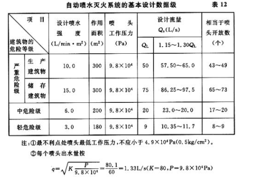 我国对设有自动喷水灭火系统的建筑物,其危险等级根据火灾危险性大小,可燃物数量、单位时间内放出的热量,火灾蔓延速度以及扑救难易程度等因素分为严重危险级、中危险级和轻危险级三级。各危险等级的建筑物,当设置湿式喷水灭火系统、干式喷水灭火系统、预作用喷水系统和雨淋喷水灭火系统时,其设计喷水强度、作用面积、喷头工作压力和系统设计秒流量等见表12。