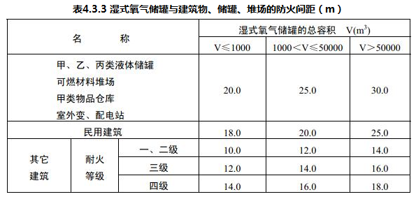湿式氧气储罐与建筑物、储罐、堆场的防火间距不应小于表4.3.3的规定;