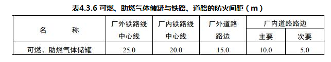 可燃、助燃气体储罐与铁路、道路的防火间距不应小于表4.3.6的规定。