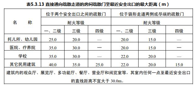 直接通向疏散走道的房间疏散门至最近安全出口的距离应符合表5.3.13的规定;