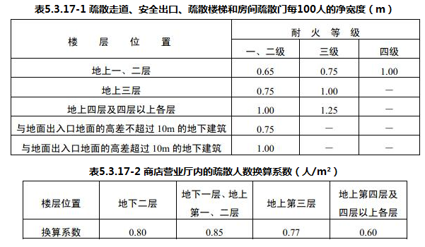 每层疏散走道、安全出口、疏散楼梯以及房间疏散门的每100人净宽度不应小于表5.3.17-1