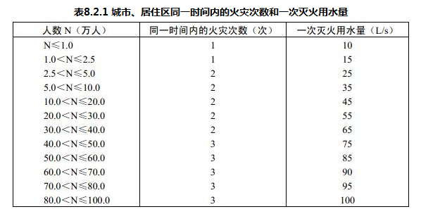 城市、居住区的室外消防用水量应按同一时间内的火灾次数和一次灭火用水量确定。同一时间内的火灾次数和一次灭火用水量不应小于表8.2.1的规定。