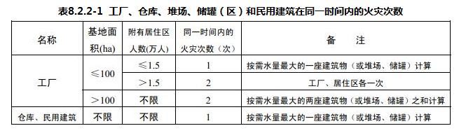 厂、仓库、堆场、储罐(区)和民用建筑在同一时间内的火灾次数不应小于表8.2.2-1 的规定;