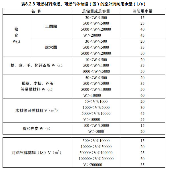 可燃材料堆场、可燃气体储罐(区)的室外消防用水量,不应小于表8.2.3 的规定。