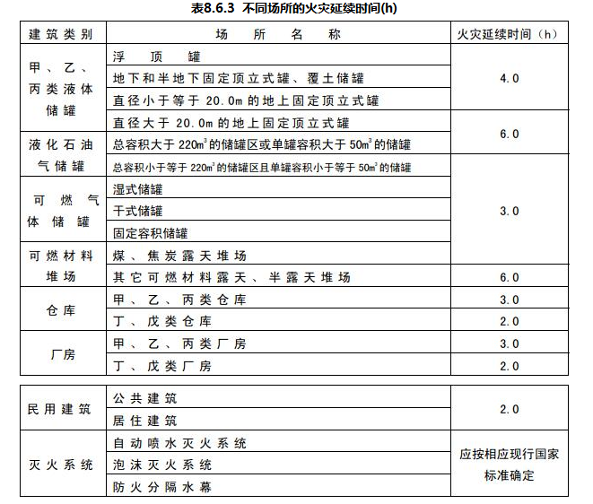 不同场所的火灾延续时间不应小于表8.6.3的规定: