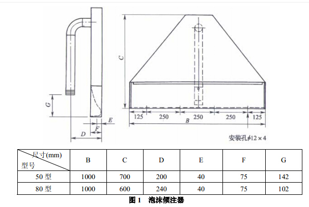 条。泡沫导流罩是应用在外浮顶储罐上的一种装置,因为外浮顶储罐的浮顶是随储存介质液位的高低浮动,为了不减少介质的储存数量,泡沫产生器出口的泡沫管道,应安装在外浮顶储罐罐壁的顶部,因此,必须设置专用装置,既能使泡沫沿罐壁向下流动,又能防止泡沫被风吹走而流失,这个装置就是泡沫导流罩。以前,因为没有封闭称作泡沫防护板。目前我国没有泡沫导流罩的定型产品,都是由设计单位出图加工,形状和尺寸都不统一。而国外某些公司都有定型图纸和系列产品,如英国的安格斯公司,称为泡沫倾注器,见图1