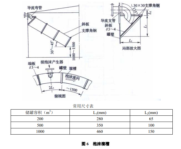 条。泡沫降落槽是水溶性液体储罐内安装的泡沫缓冲装置中的一种。因为水溶性液体都是极性溶剂,如:醇、酯、醚、酮类,它们的分子排列有序,能夺取泡沫中有OH-、H+离子,而使泡沫破坏,故必须用抗溶性泡沫液才能灭火,同时又要求泡沫平缓地布满整个液面,并具有一定的厚度,所以要求设置缓冲装置以避免泡沫自高处跌入溶剂内,由于重力和冲击力造成的泡沫破裂,影响灭火。常用的泡沫降落槽,其尺寸是与泡沫产生器配套设计的。我国常用的如图3
