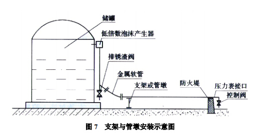 6 泡沫产生装置入口处的管道应用管卡固定在支架上,其出口管道在储罐上的开口位置和尺寸应符合设计及产品要求。
