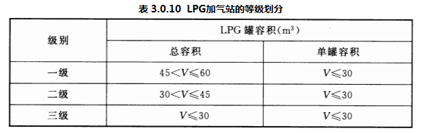 注:柴油罐容积可折半计入油罐总容积。3.0.10 LPG加气站的等级划分应符合表3.0.10的规定。