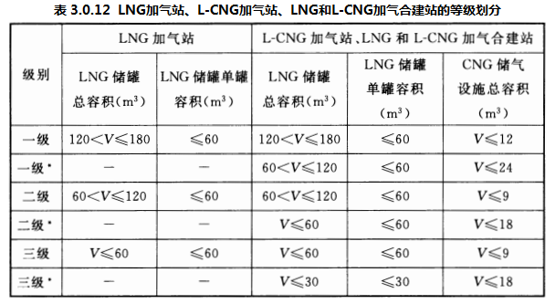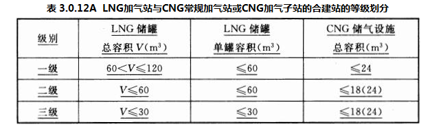 5 CNG常规加气站可采用LNG储罐做补充气源,但LNG储罐容积、CNG储气设施的总容积和加气站的等级划分,应符合本规范第3.0.12条的规定。3.0.12 LNG加气站、L-CNG加气站、LNG和L-CNG加气合建站的等级划分,应符合表3.0.12的规定。