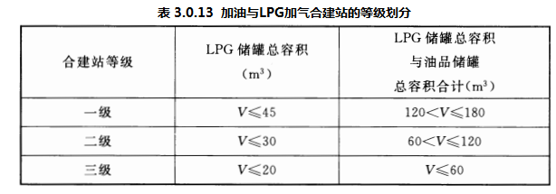 注:表中括号内数字为CNG储气设施采用储气井的总容积。3.0.13 加油与LPG加气合建站的等级划分,应符合表3.0.13 的规定。