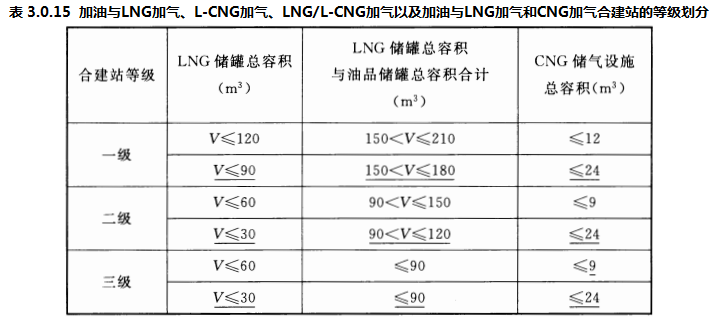 3.0.15 加油与LNG加气、L-CNG加气、LNG/L-CNG加气以及加油与LNG加气和CNG加气联合建站的等级划分,应符合表3.0.15的规定。