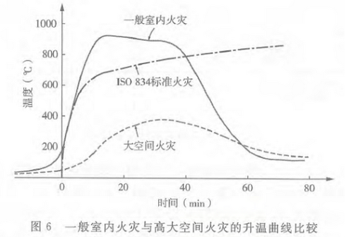 建筑火灾一般是从建筑内部的某一空间起火开始而造成的结果,通常可分为火灾初期增长阶段、全盛阶段、衰退阶段三个阶段。火灾的发展过程及其严重程度,取决于室内可燃物的燃烧性能、数量及分布情况(火荷载密度)以及着火房间的大小、形状、通风状况等因素。图6为一般室内火灾、高大空间火灾这两种典型的建筑火灾着火空间的环境温度升温曲线的比较。