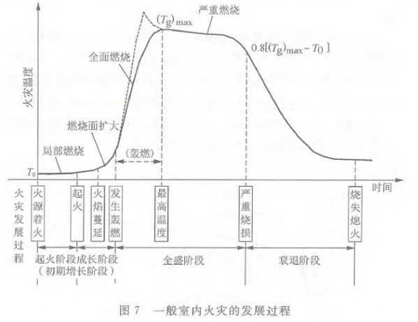 一般,室内火灾在初期增长阶段、全盛阶段之间有一个标志着火灾发生质变的现象——轰燃现象(图7)。这时室内所有可燃物都将着火燃烧,环境温度急剧升高,危及结构安全。轰燃现象是一般室内火灾过程中一个非常重要的现象,持续时间很短。
