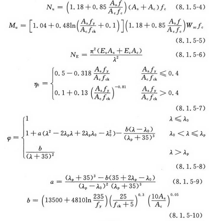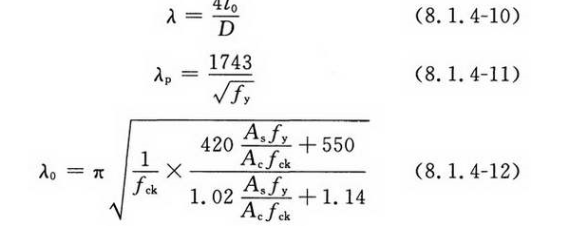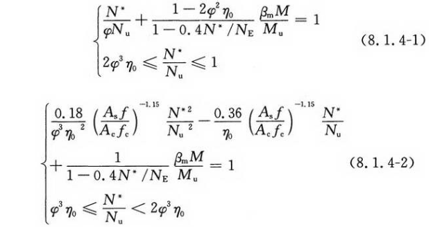常温下圆钢管混凝土柱的抗压承载力设计值N*,当M/Mu≤1时,应按式(8.1.4-1)计算确定;当M/Mu>1时,应按式(8.1.4-2)计算确定: