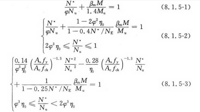 常温下矩形钢管混凝土柱的抗压承载力设计值N*,应取其平面外和平面内失稳承载力的较小值。其中,平面外失稳承载力应按式(8.1.5-1)计算确定;当M/Mu≤1时,平面内失稳承载力应按式(8.1.5-2)计算确定;当M/Mu>1时,平面内失稳承载力应按式(8.1.5-3)计算确定: