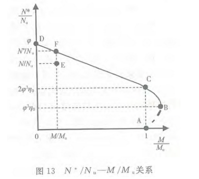 式(8.1.4)、式(8.1.5)适用于钢管混凝土柱受压破坏的情况。以下通过图示方式解释式(8.1.4)的物理意义。图13所示为压弯圆钢管混凝土柱的N* /Nu -M/Mu关系曲线,可采用直线段CD和抛物线段AC来描述:当M/Mu≤1时,直线段CD表示式(8.1.4-1);当M/Mu>1时,抛物线段AC表示式(8.1.4-2)。式(8.1.4)不适用于钢管混凝土柱受拉破坏情况,因此当N/Nu<φ3η0时,抛物线段AB用虚线表示。图中,A点为单纯受弯矩作用时的工况;B点为受拉破坏和受压破坏的临界点;C点为N* /Nu-M/Mu关系曲线变化的分界点;D点为单纯受轴心压力作用时的工况;C点与A点关于抛物线对称轴对称;E点表示计算构件段范围内的某一最不利轴向压力和弯矩组合(N,M),其对应的承受压弯作用时钢管混凝土柱的抗压承载力设计值N*如图中F点所示。
