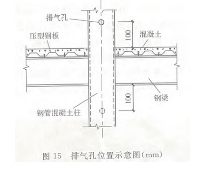 钢管混凝土柱应在每个楼层设置直径为20mm的排气孔。排气孔宜在柱与楼板相交位置的上、下方100mm处各布置1个,并应沿柱身反对称布置。当楼层高度大于6m时,应增设排气孔,且排气孔沿柱高度方向间距不宜大于6m。