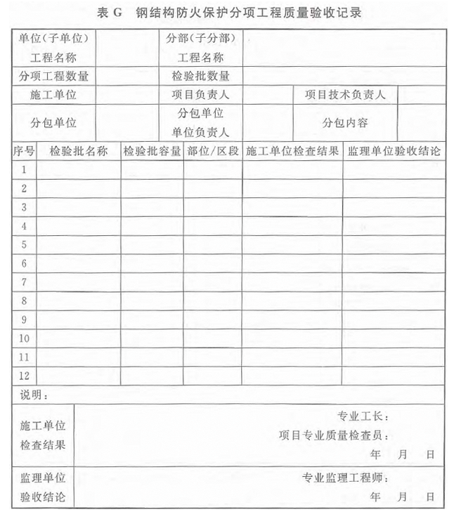 钢结构防火保护分项工程质量应由专业监理工程师组织施工单位项目专业技术负责人等进行验收,并应按表G记录。