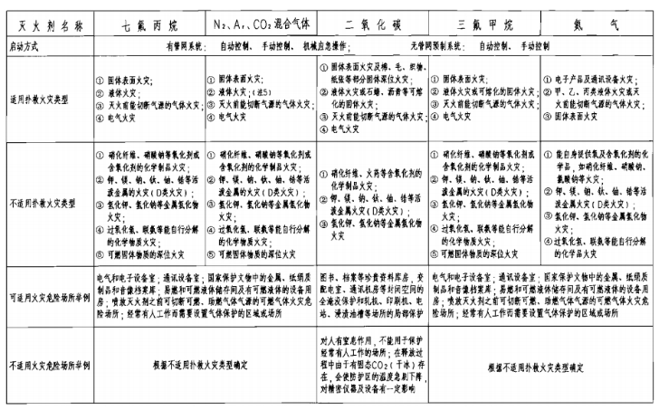 注:5.由于IG-541灭火系统灭火效能相对较低,在高压喷放时可能导致可燃易燃液体飞溅及汽化,有造成火势蔓延扩大的危险,故一般不提倡用于扑救主燃料为液体的火灾。