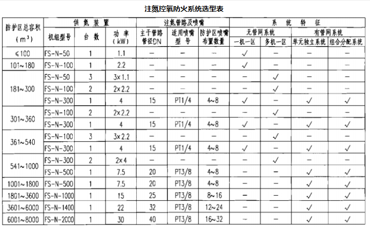注:表中单元独立系统是指一台供氮装置只保护一个防护区的有管网注氮控氧防火系统;组合分配系统是指一台供氮装置通过管网的控制分配,保护两个或两个以上防护区的有管网注氮控氧防火系统,一个组合分配系统所保护的防护区不应超过8个。