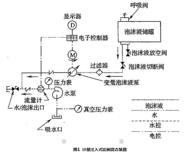 3.4.3 计量注人式比例混合装置是近年发展起来的一种新型比例混合装置。该装置主要由泡沫液泵、水泵、流量计、电子控制器、 泡沫液储罐等组成。其基本原理为:利用流景计实时监控系统运行条件,并向电子控制器反馈流量信号,电子控制器接收到相应流量数据的电信号后,会控制泡沫液泵按相应流量供给泡沫液,以达到维持恒定混合比的目的。其运行不受水压影响,并且也不会因补充泡沫液而中断。图1为一典型计量注入式比例混合装置的流程图,该流程在水管道上设有流量计,主要监测水的流量,并利用变量泡沫液泵控制泡沫液的流量。在工程中,也可同时在泡沫液管路上设置流量计,进行泡沫液流量的监测。另外,可使用变频技术来控制泡沫液泵的流量。对于该类型的装置来说,流量测量的准确性将直接影响混合比的精确性。因此,要求流量计的进口前和出口后直管段的长度不小于10倍的管径。