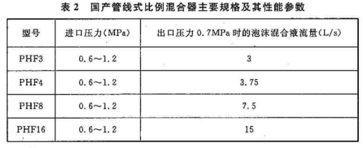 3.4.6 管线式比例混合器工作流量范围小(参见表2),压力损失大(约为进口压力的1/3),通常用于移动式或半固定式泡沫灭火系统。本条是依据有关试验制定的。