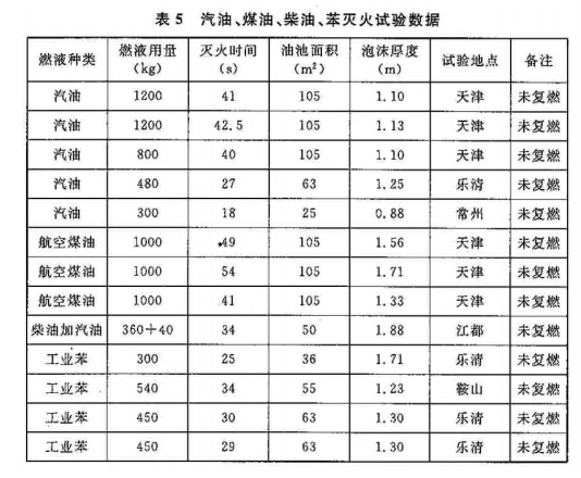 对于易燃、可燃液体火灾所需的泡沫淹没深度,我国对汽油、柴油、煤油和苯等做过的大量试验,积累的灭火试验数据见表5。表中所列试验,其油池面积、燃液种类和牌号以及试验条件不尽相同,考虑到各种因素和工程应用中全淹没高倍数泡沫灭火系统可能用于更大面积的防护区,故对汽油、煤油、柴油和苯的泡沫淹没深度规定取表中的最大值。对于没有试验数据的其他甲、乙、丙类液体,需由试验确定。