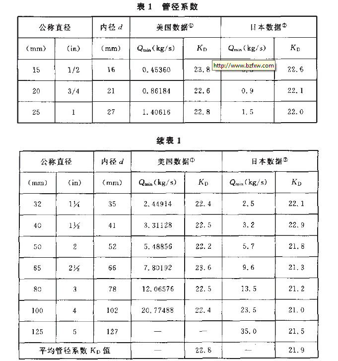 其他国外标准没提供管径系数KD数据,主张采用生产厂家提供的数据。在搜集到的资料中,有两组数据所得管径系数KD值与本规定接近,具体如表1所示: