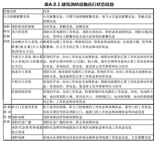 A.0.1联网用户的建筑消防设施运行状态信息内容应符合表A.0.1的要求。