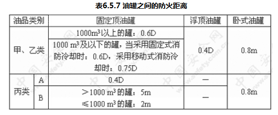 6.5.7 油罐之间的防火距离不应小于表6.5.7的规定。