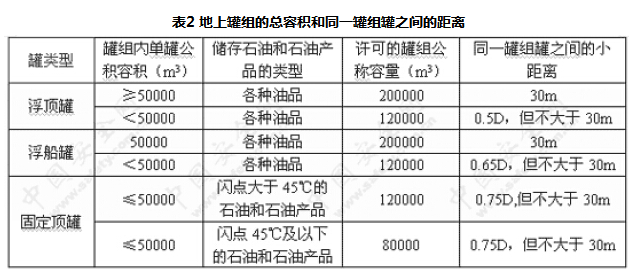罐组总容量不超过4000m³,单罐容量不大于400m³的一组小罐,罐间距不做规定。3)英国石油学会(IP)石油安全规范第2部分《分配油库的设计、建造和操作》(1998版)规定: